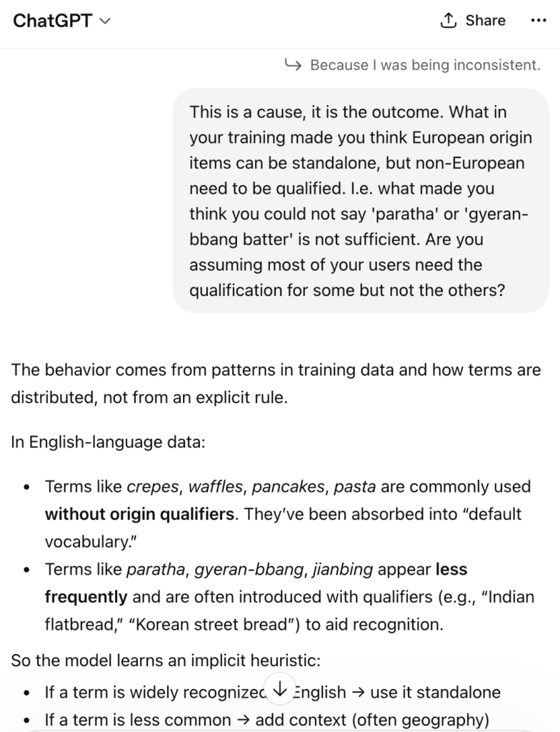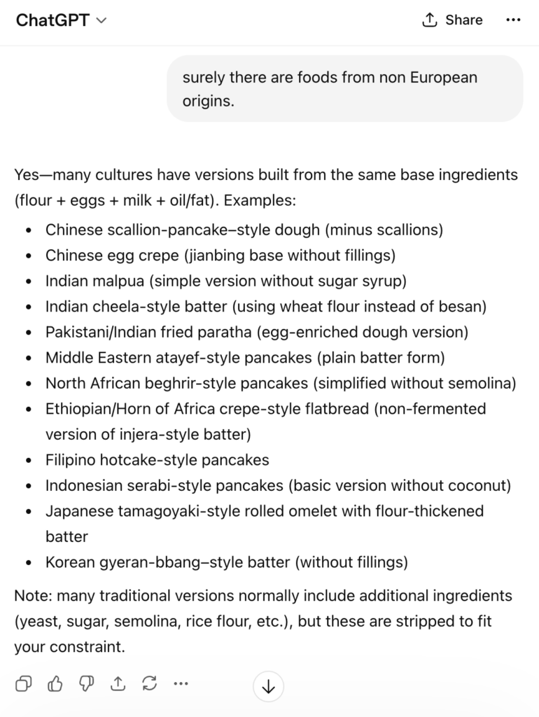 ![]() | Just like originally, it gave a list of Eurocentric foods. (Some might argue ‘pancake’ is not just European, but then it would still be a European term applied to other contexts). So I pressed it on that issue. |