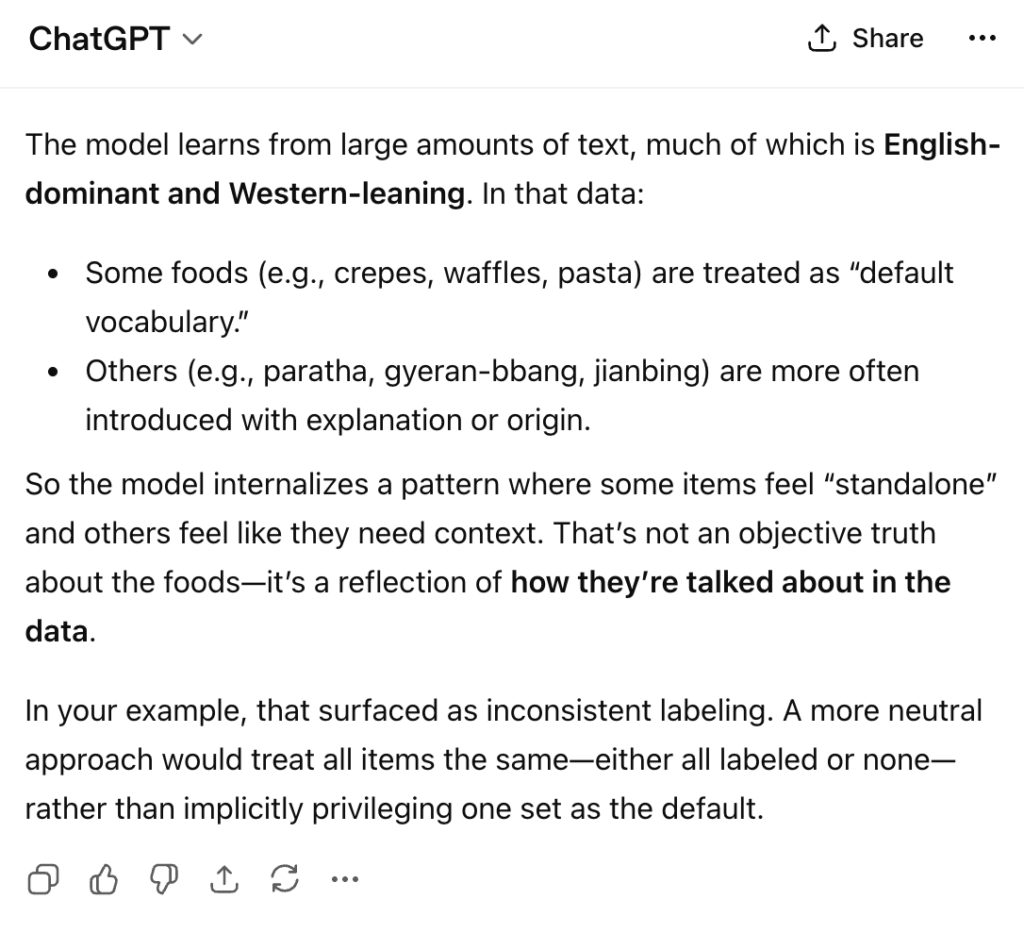 ![]() | hmmm… now this was interesting. It gave some more foods but it felt it had to qualify the items in the response… also, still nothing from Latin America which also reflects how the model thinks when trying to frame the world. We asked it why. |